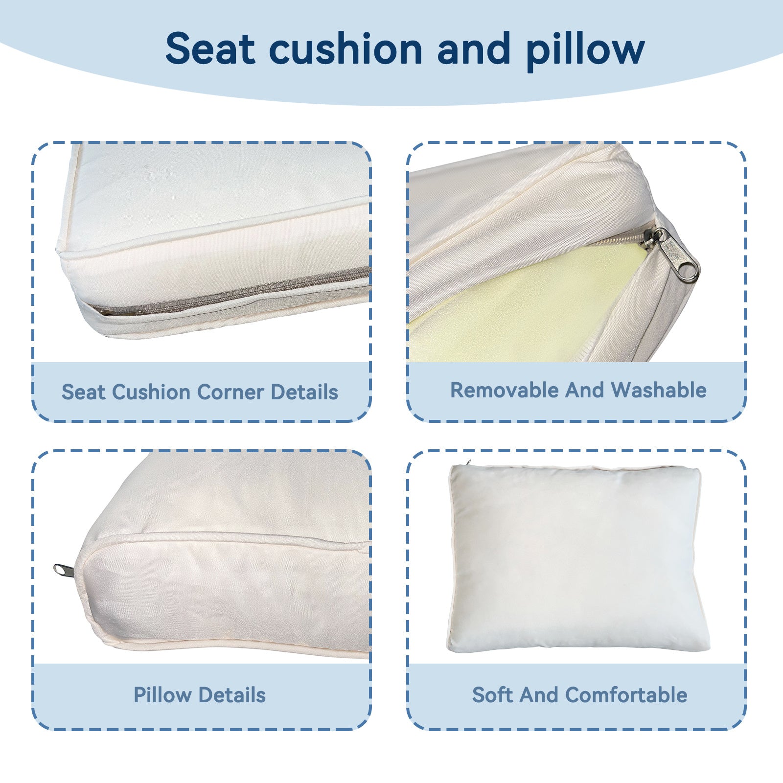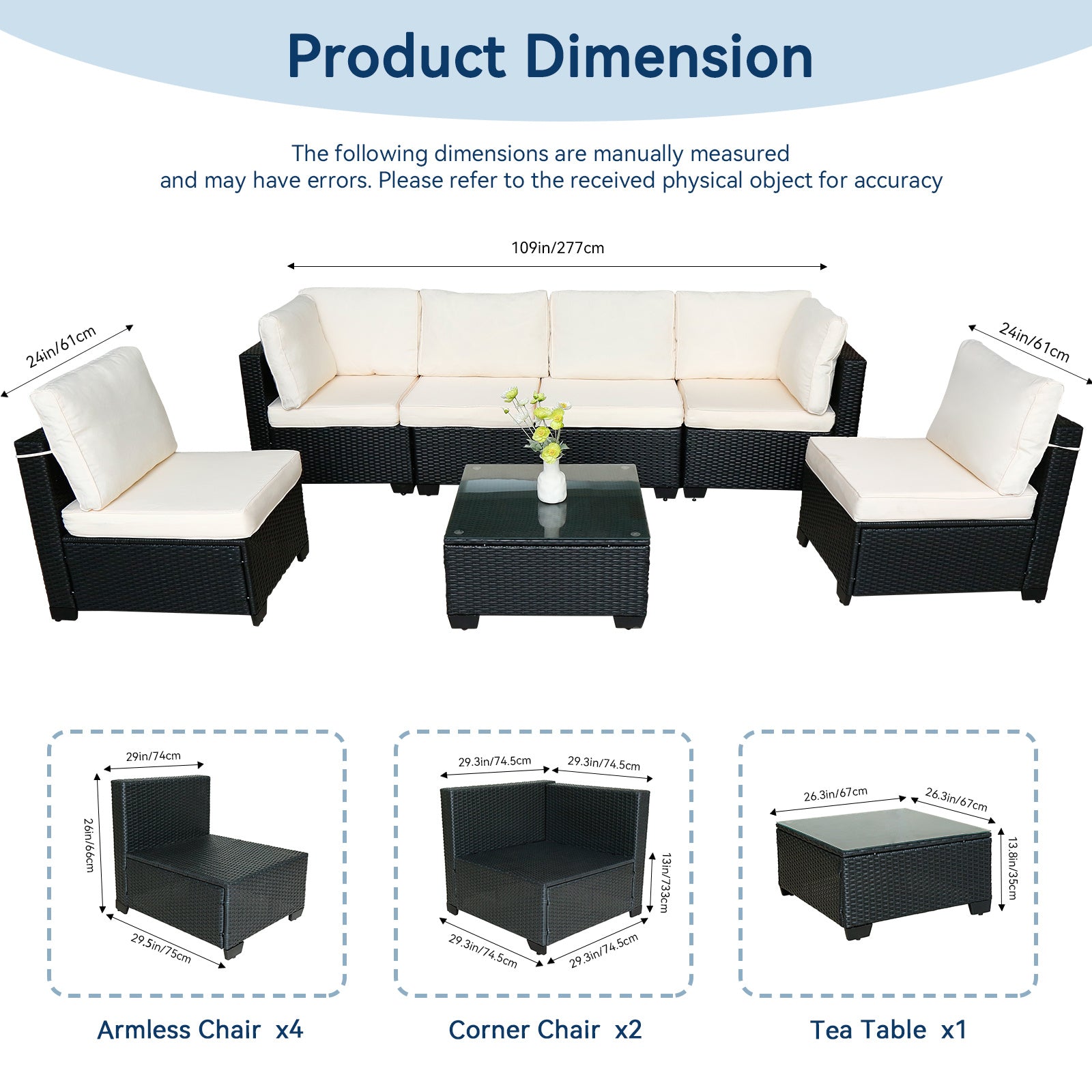 7-piece set of black rattan with blue cloth cover:PE+metal frame, galvanized pipe 15*15*0.7MM, black rattan 9*0.95, cushion 10CM250D, fabric 202g polyester waterproof cloth, back padding 1.1KG, 5MM tempered glass